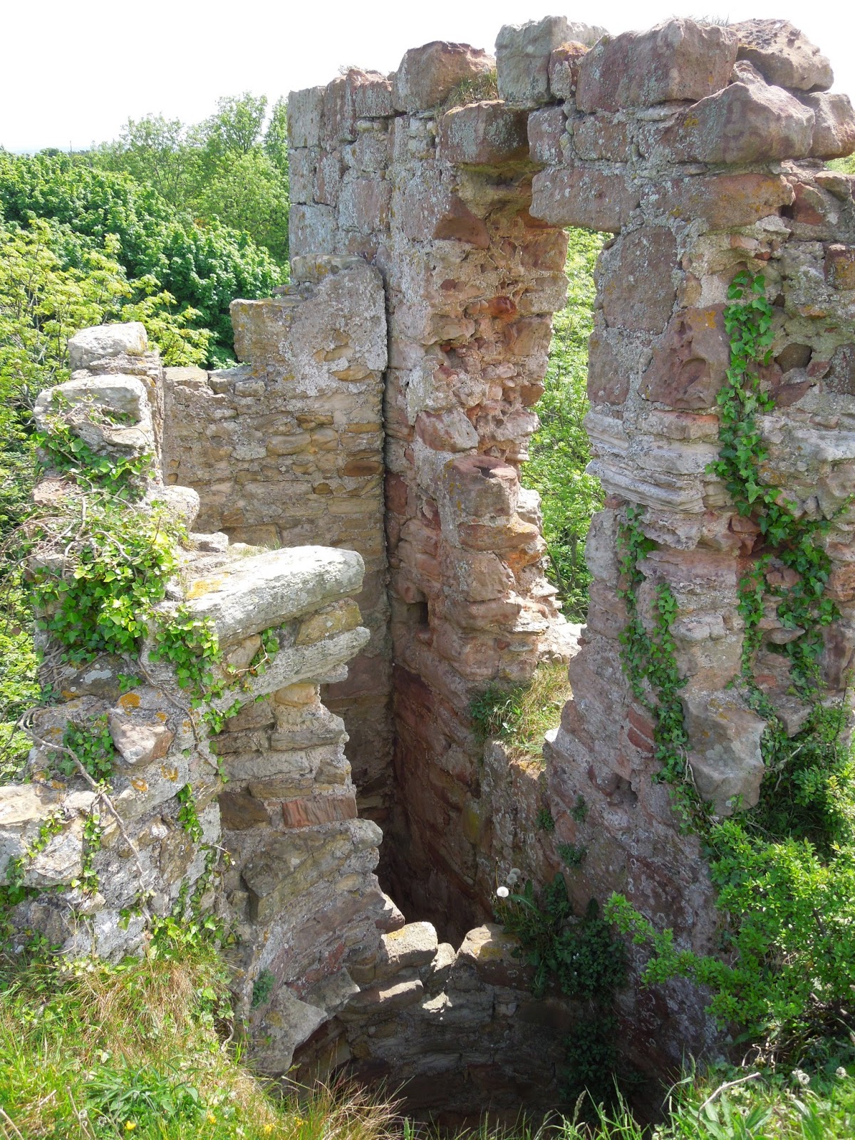 Innerwick castle built in the 14th century,it's a real shame that this castle has been allowed to fall into such a state of disrepair with all the ivy etc bursting through the walls. The bottom photo is an artists impression how the castle looked in its day.