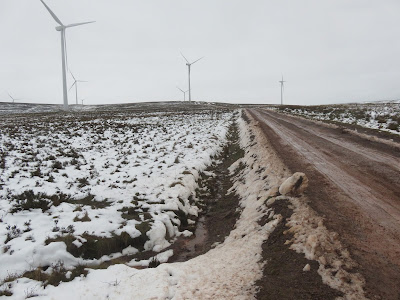 It was a difficult ride cycling up the Aikengall wind farm road, the road was just a slush of mud & crushed ice with all the tipper lorries going up & down to the new phase of the wind farm at Wester Dodd, it was like cycling through a plate of mince & tatties !